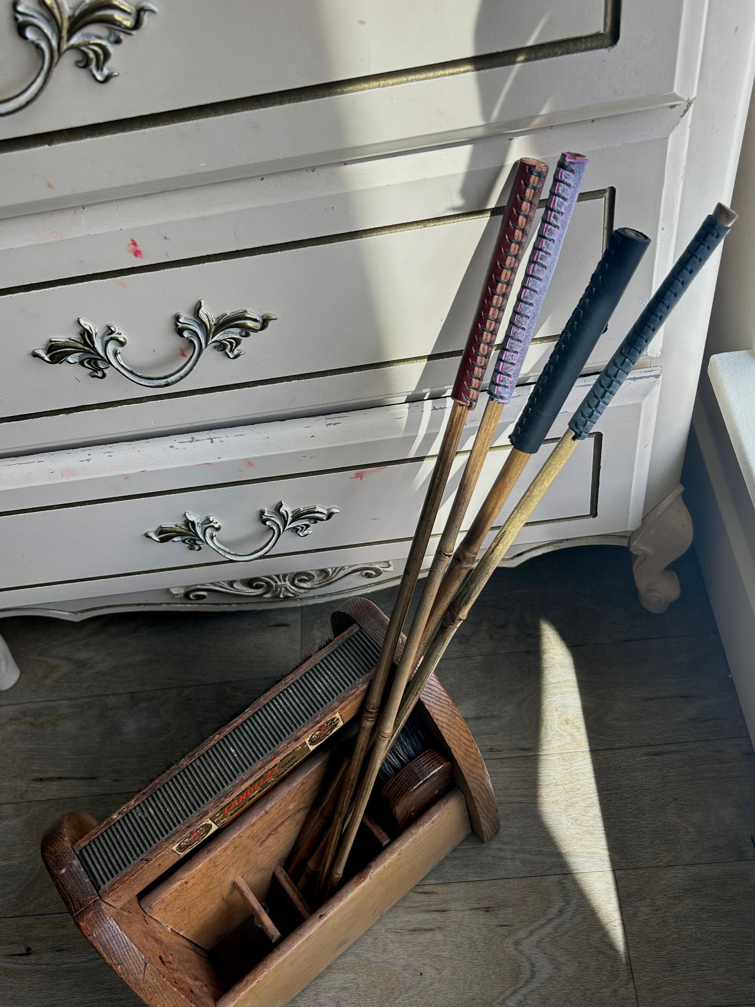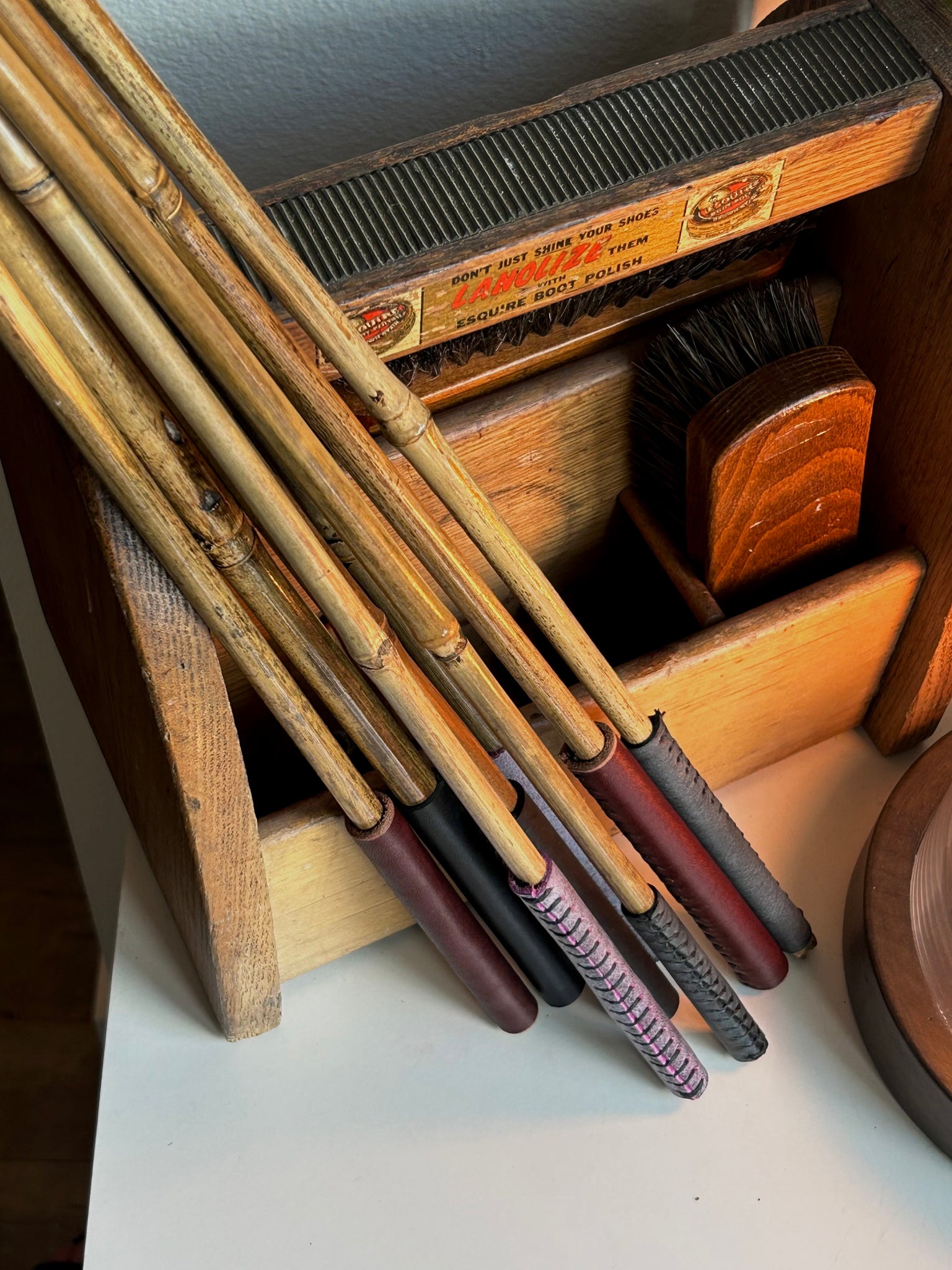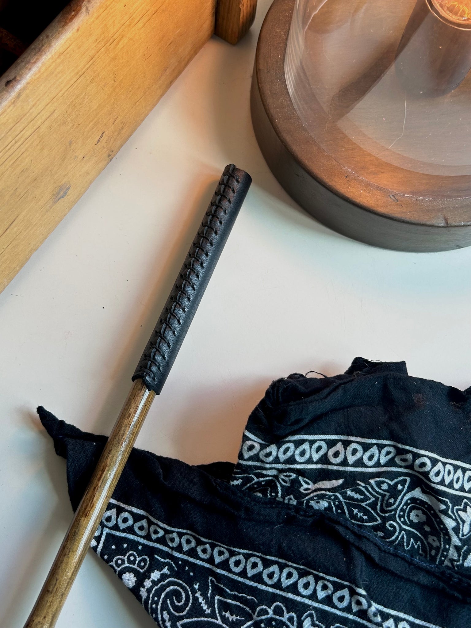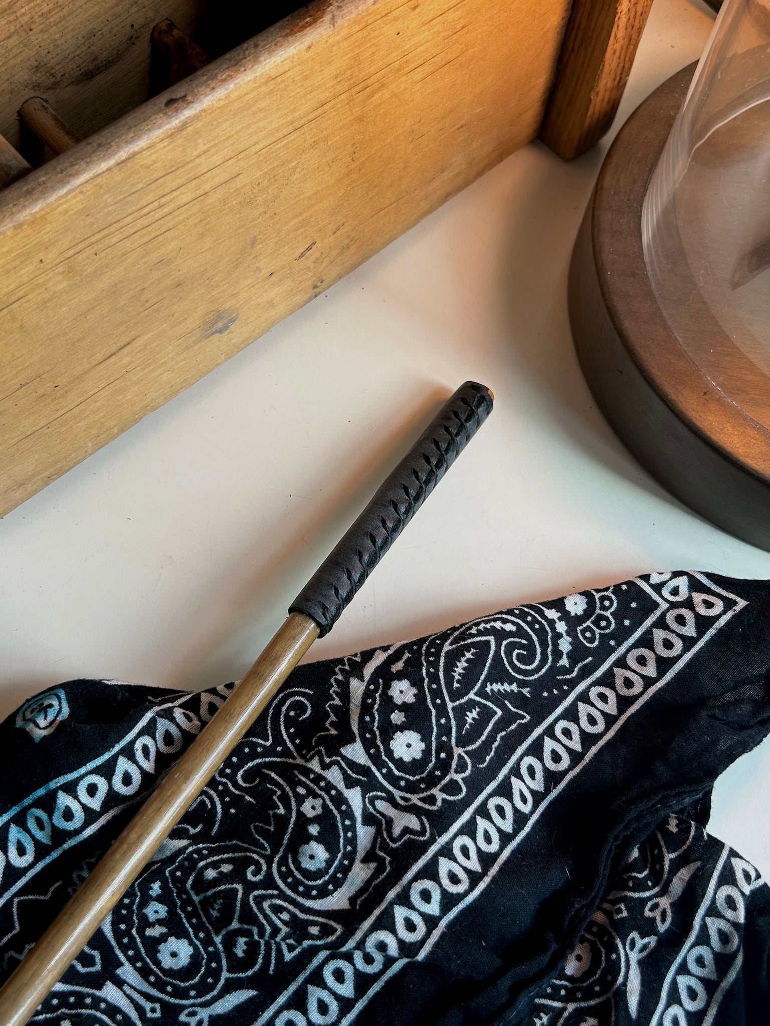 sanded bamboo cane treated with tung oil and a wrapped leather handle