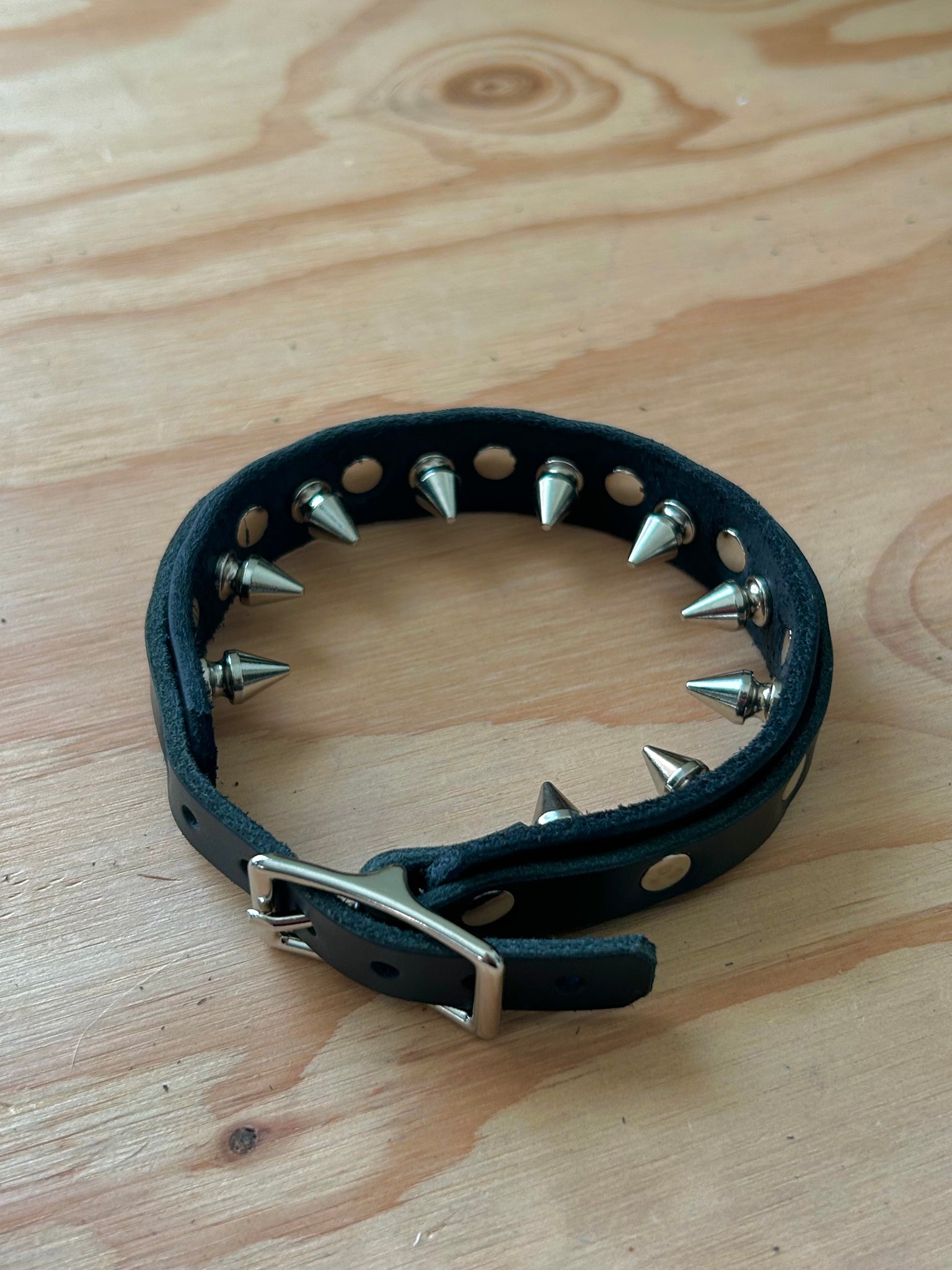 internally spiked cuff for bicep with black latigo leather and stainless steel hardware. east way of keeping yourself or your loved one in consistent pain, in a visually subtle way.