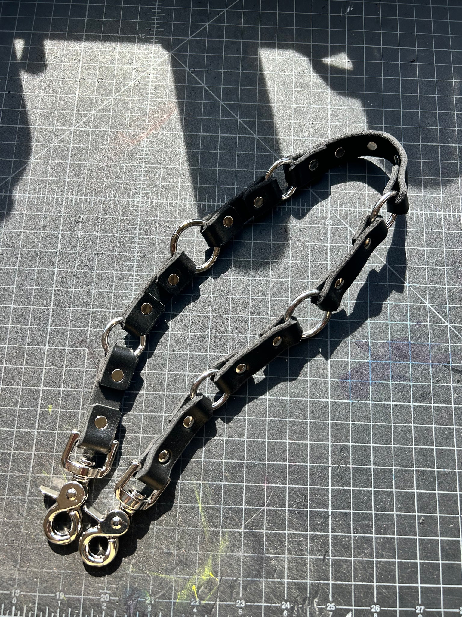 black latigo leather chained together with alternating o-ring sizes