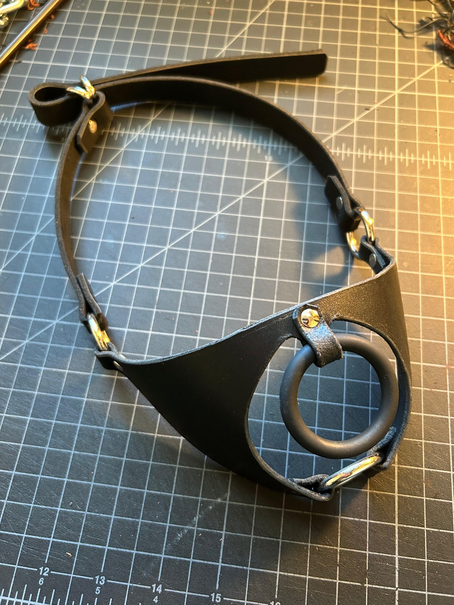 Black latigo leather with stainless steel hardware. The black rubber O-ring is body safe material, and very fun to chew. Double back fastener for a snug and comfortable fit.