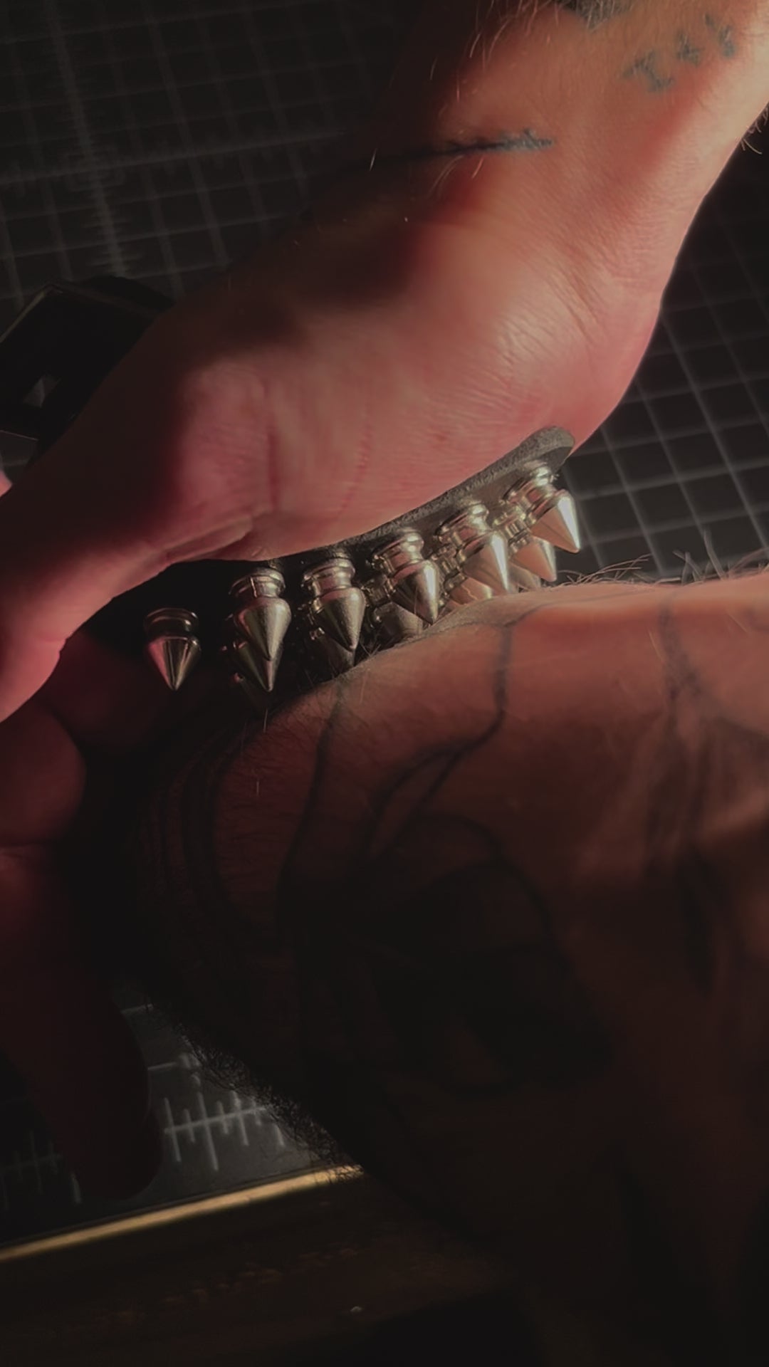 9/10 ounce latigo leather with stainless steel spikes. Measure around your hand for size