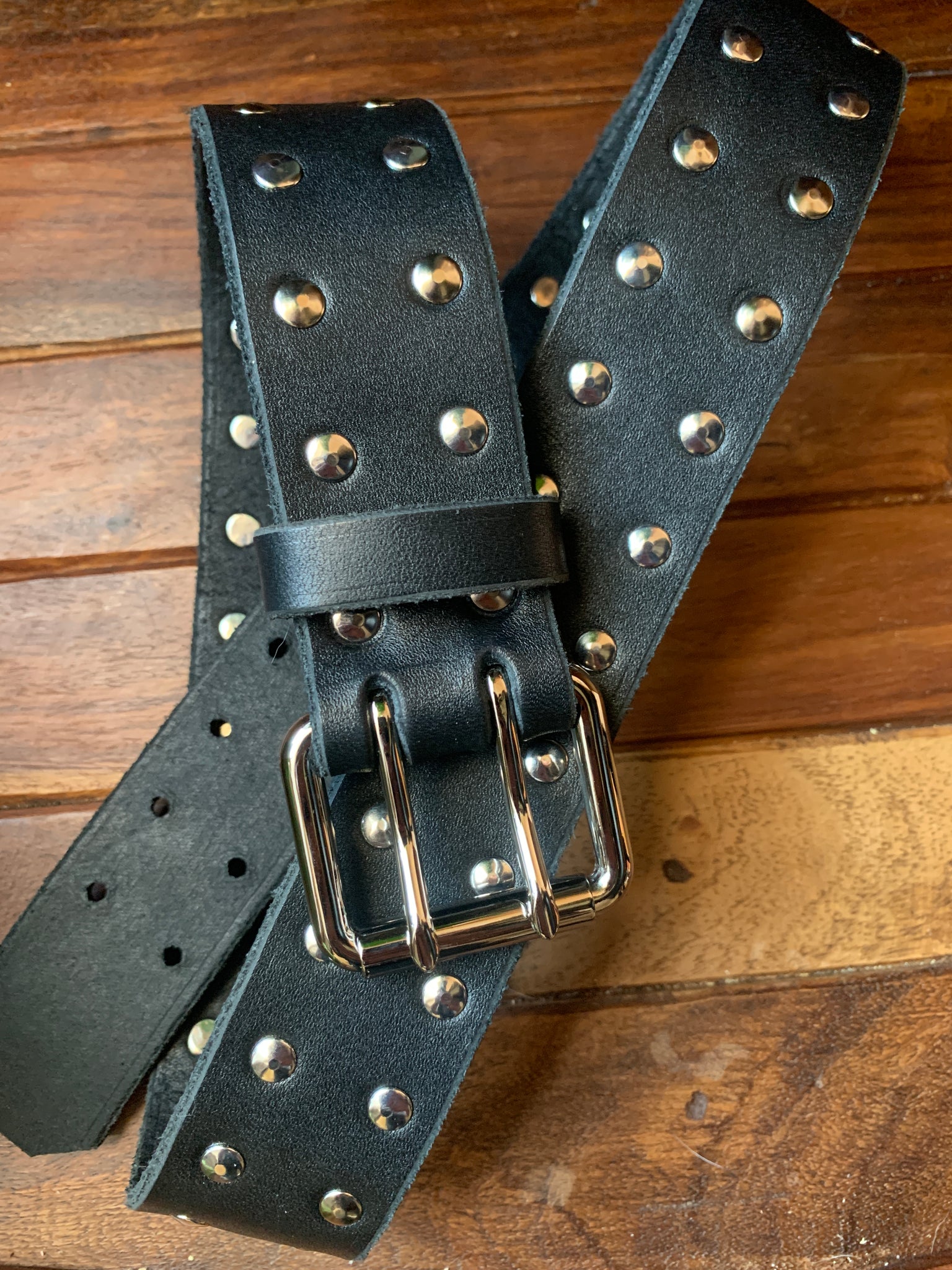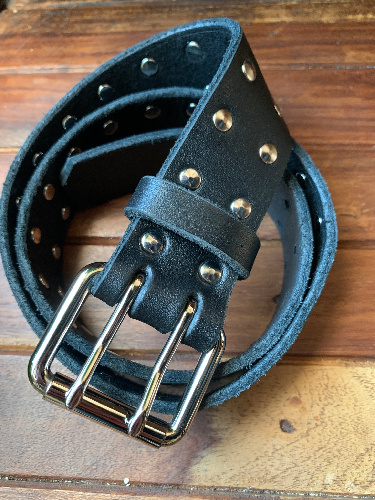 nickel two-prong belt buckle with rivets all along the length of your belt. heavy gauge black latigo leather makes this a durable daily driver, while also being a versatile impact tool.