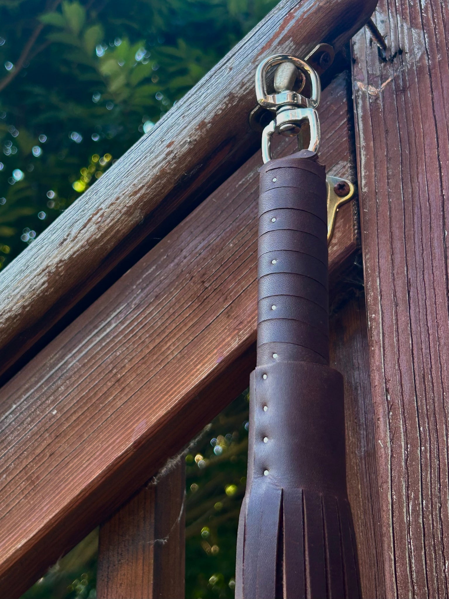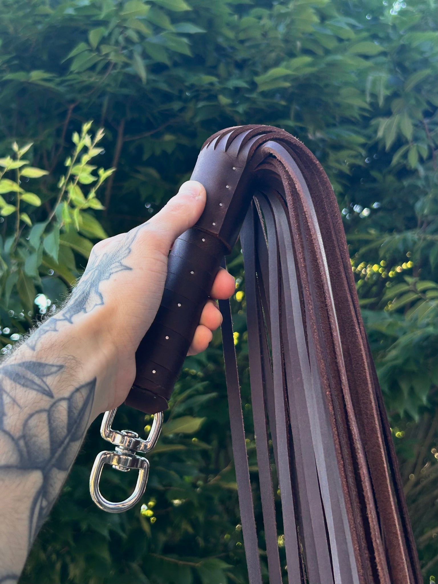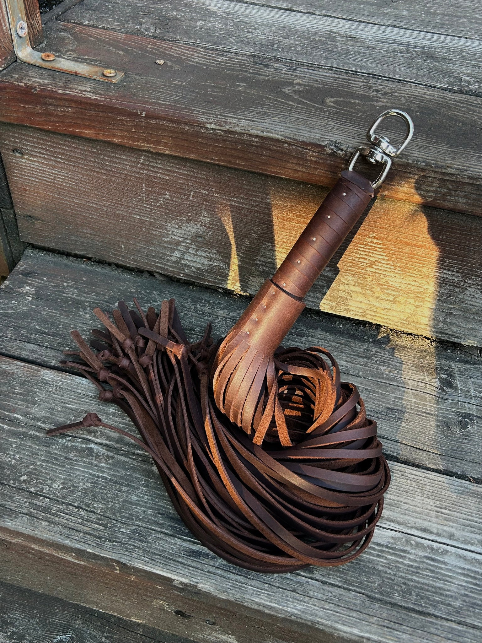 cocoa oiled chap leather flogger with individual knots on each fall, dressed with stainless steel handle hardware.